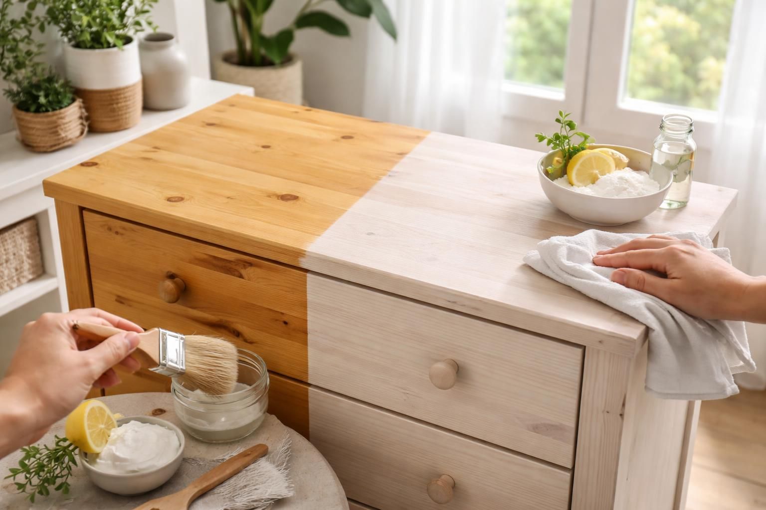 Pour les meubles présentant un jaunissement plus persistant, une solution plus puissante s’impose. En mélangeant à parts égales du vinaigre blanc, du bicarbonate de soude et du jus de citron frais, vous obtiendrez une réaction chimique douce qui aidera à décomposer les taches jaunies. L’application peut durer entre 5 et 10 minutes, suivie d’un rinçage abondant.