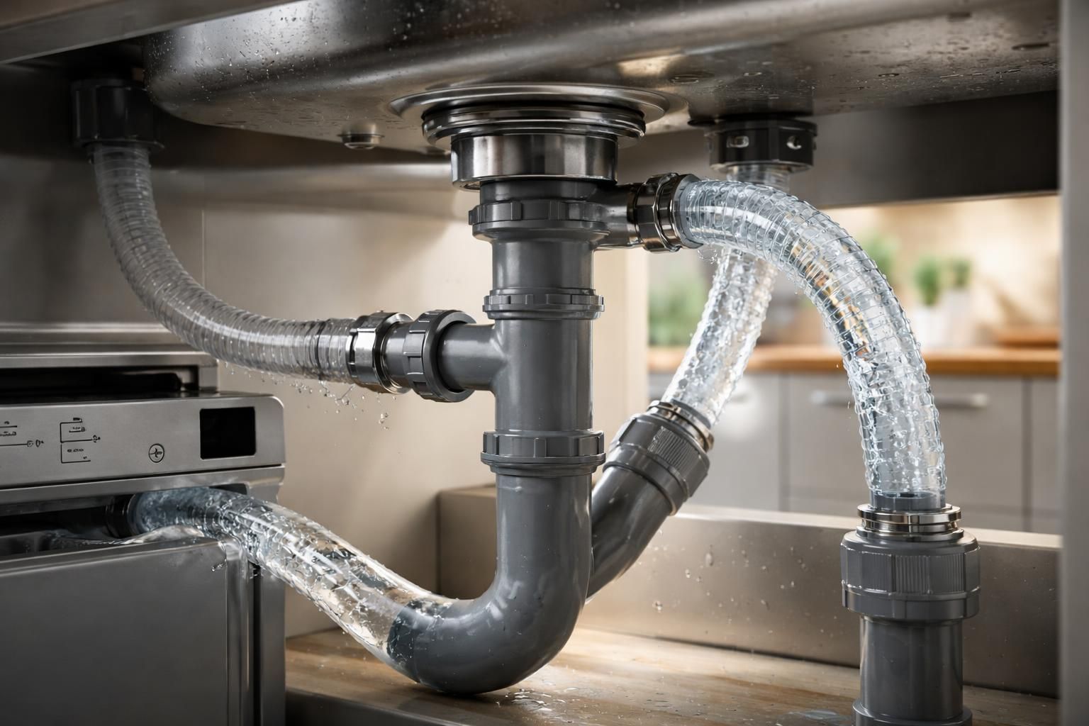 Opter pour un système d’évacuation partagé respecte également les normes de plomberie en vigueur. Un siphon commun conserve la garde d’eau nécessaire pour bloquer les mauvaises odeurs tout en permettant l’évacuation simultanée des deux appareils. Cela garantit non seulement un environnement sain dans la cuisine mais évite également des interventions coûtant cher si le système d’évacuation venait à mal fonctionner.